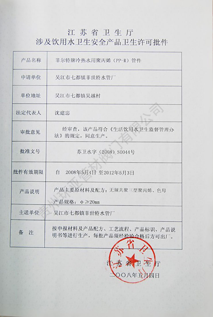 菲爾特牌冷熱水用聚丙烯(PP-R)管件安全衛(wèi)